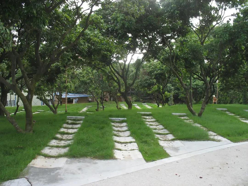 在停車場的建設中,利用地勢高差,結合林間空地開辟停車位,同時停車位中只有二側輪子的地方有鋪裝,所有的地面都進行綠化,最大程度的減少停車對環境的損害,且具備一定的蓄水功效。