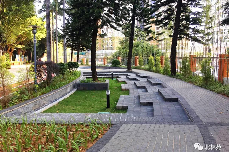 為了將海綿建設很好的融入校園改造中,踐行學校“綠色校園”的辦學理念,打造深圳市海綿校園示范基地,設計團隊對場地地形進行了重新梳理,將雨水花園運用到校園提升設計中,保留現存長勢良好的植物,結合地形,打造下凹式綠地,將下凹式綠地與臺階結合形成校園的開放空間,以直觀、形象的方式展示植物的作用,營造互動式景觀,在增加活動場地的同時又能寓教于樂。