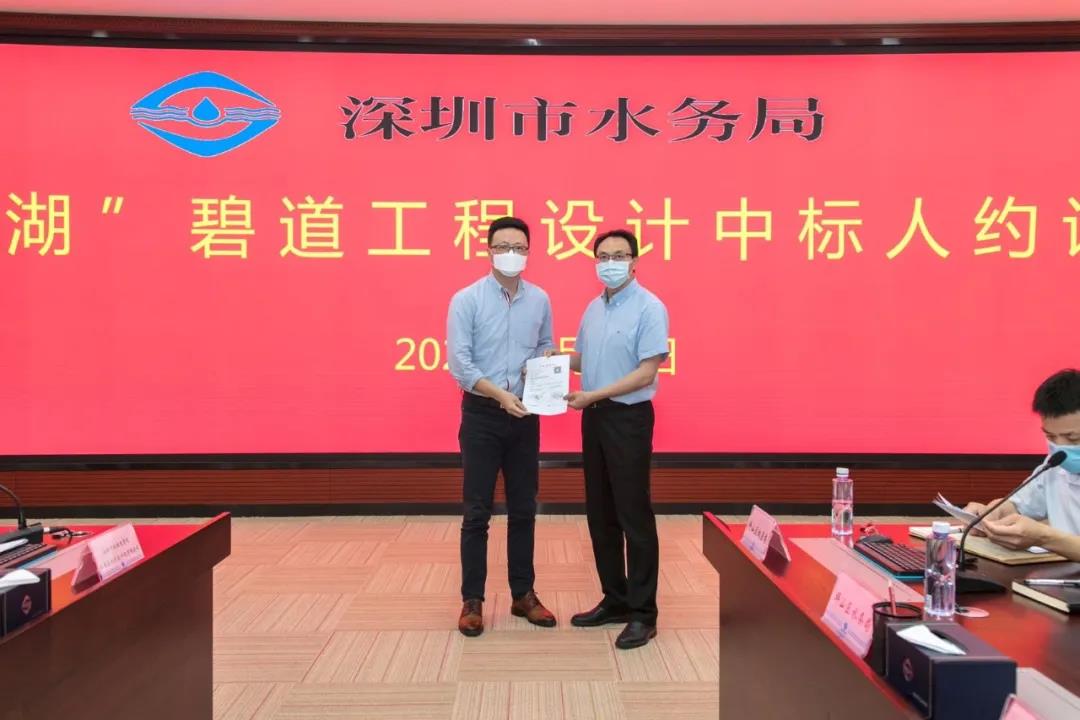 5月11日, 由深圳市水務局組織的“三河一湖" 碧道工程設計中標人約談會順利召開,北林苑葉楓院長代表聯合體單位上臺領取中標通知書。