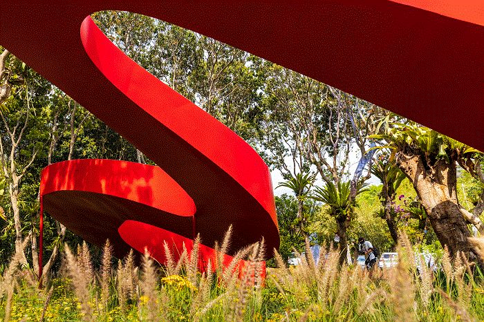 花園設計借用山水畫“之山折水”的敘事結構,在方寸場地中,打造多重畫意。主構筑物“驚鴻”靈動張揚,以草書“愛”字筆勢為創作元素,迂回縈繞,氣韻生動,與近景大臺階,遠景山林形成無盡延伸的幻象。