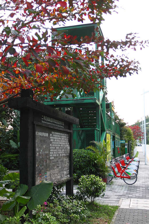 該段保留了原特區(qū)“二線關(guān)”的石板路、鐵絲網(wǎng)及邊境軍事設(shè)施。昔日的“二線鐵絲網(wǎng)”,今日則成為綠色蔓延、花草絢爛的自然野趣之地。行走在綠道上,不僅可以觀賞廢棄集裝箱建成的服務(wù)點和興趣點,廢棄枕木做的綠道標識牌,還可以觀賞摩天樓宇和城市天際線,是廣大市民冬日休閑的好去處。