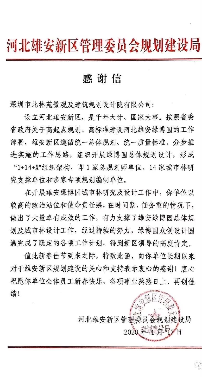 2020-01-212020年剛開局,北林苑喜訊頻傳,1月17日,北林苑收到了河北雄安新區管理委員會規劃建設局發來的感謝信。